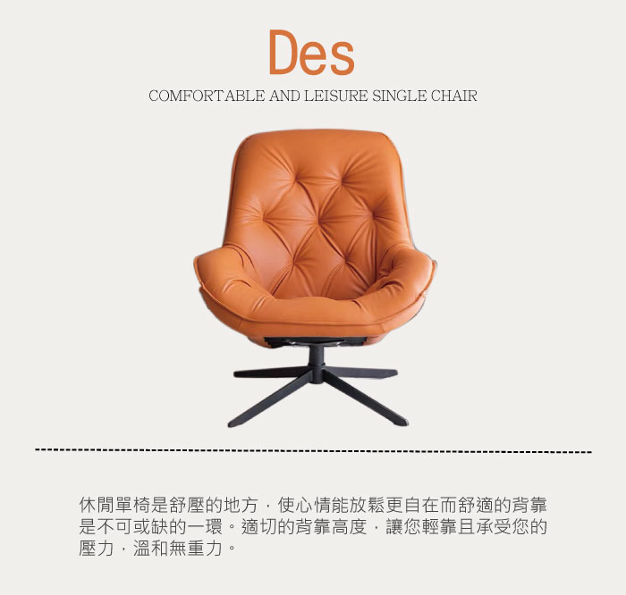 德斯單人椅,旋轉搖椅,全方位滿足你。人體工學角度能緊密支撐背部,貼合人體,給您恰到好處的承托,釋放一整天的壓力和疲倦,舒適放鬆;