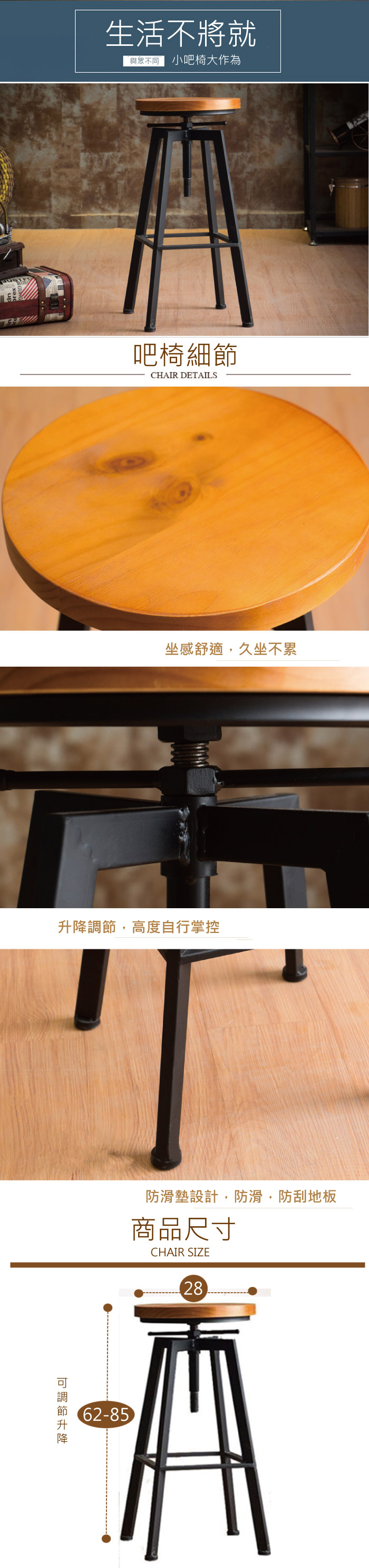 【AISHA】科隆LOFT工業風旋轉吧台椅,復古工業風餐桌椅,手工打造餐椅所以每一件產品尺寸、表面圖案及顏色都會有些差異,每一件質感的餐椅都是獨一無二的,LOFT工業風旋轉吧台椅讓生活不將就,與眾不同,小吧椅大作為,LOFT工業風旋轉吧台,坐感舒適,久坐不累,LOFT工業風旋轉吧台椅的高度是可以升降調節,高度自行掌控,LOFT工業風旋轉吧台椅有防滑墊設計,防滑,防刮地板,貼心的設計。