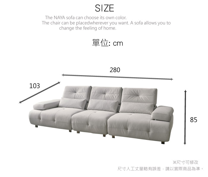 尺寸說明:單位/CM:長280 / 深 103 / 總高 85