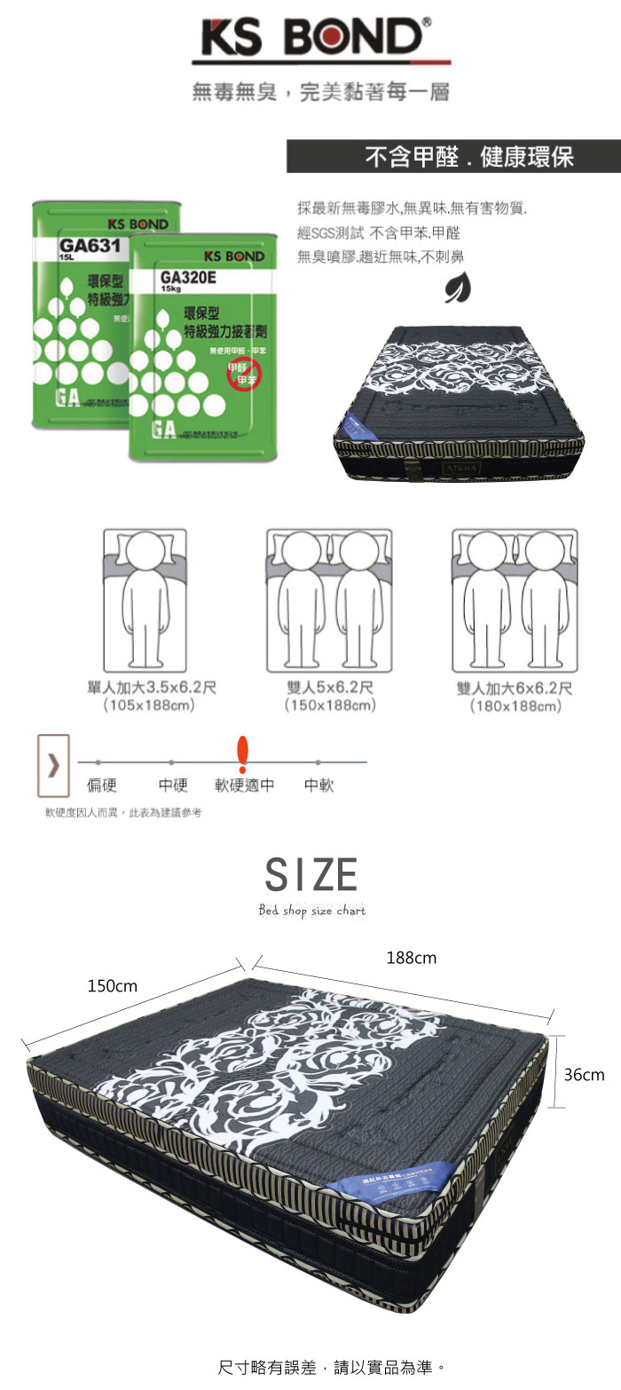 ★乳膠獨立筒床墊尺寸(cm):寬150 深188 厚36