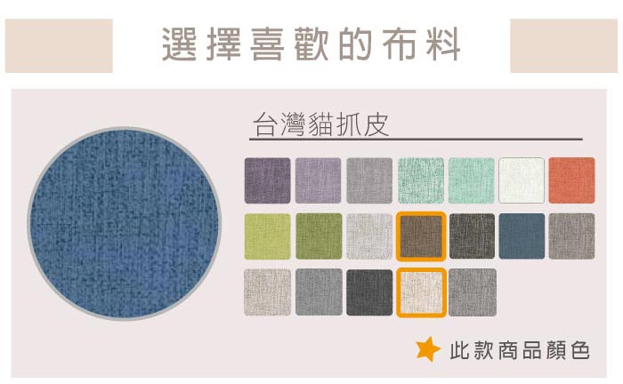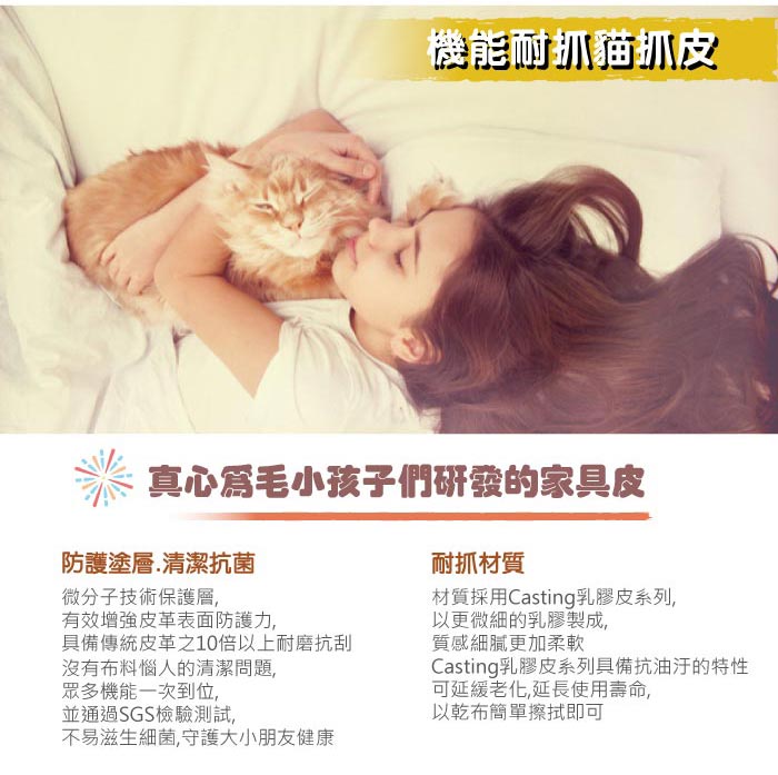 外表使用抓貓抓皮料, 貓抓皮沙發的特性是耐燃、易清潔、強韌耐抓、防霉抗菌、雷射透氣、柔軟舒適,貓抓皮料髒汙好擦拭,容易清理、不易滲透。