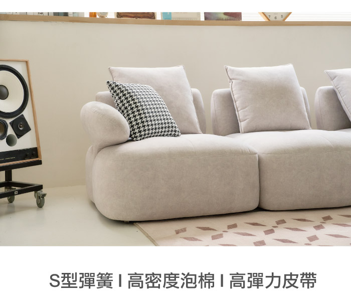 沙發材質解析:1.實木框架;結實.承重強.耐用2.高密度泡棉;高回彈.不變形.不塌陷3.彈力棉靠背;柔軟舒適.透氣.不變形4.親膚貓抓布面料;柔軟有韌性.透氣親膚