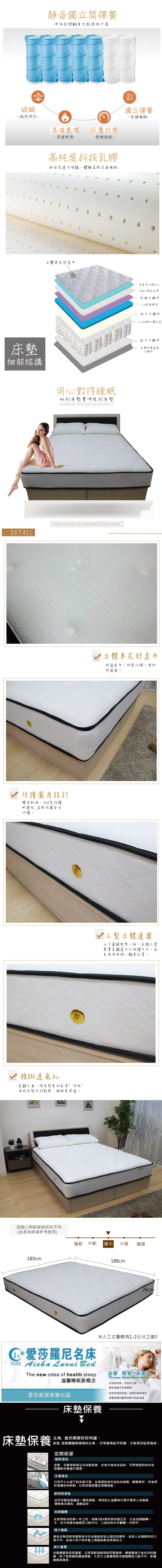 【AISHA】雅典娜 二線乳膠獨立筒床墊雙人加大床墊,一張好的乳膠獨立筒床墊讓您好眠好夢,獨立封裝彈簧,沒有金屬摩擦聲回談迅速,均衡承托貼合S型曲線.獨立筒獨特性因每個彈簧皆個別運作,因此躺在上面的兩人中一人翻身或離開,另一人不會受到絲毫影響,可以確保睡眠安穩舒適,對頭部,腰部,腿部的壓力幾乎為零,非常舒適,頭部和頸部的血液循環良好,有利於進入深度睡眠,乳膠獨立筒床墊四角有防撞圓角設計,精緻透氣孔,美觀大氣,使床墊更加容易"呼吸"保持床墊內的乾爽,睡眠更舒適!乳膠獨立筒床墊有工整立體邊圍,上下邊縫對齊一致,走線工整,緊實美觀還可以保護內芯,延長使用時間,顯彰品質,乳膠獨立筒床墊是使用立體車花舒柔布,舒適表布,加厚泡棉,增加舒適感。