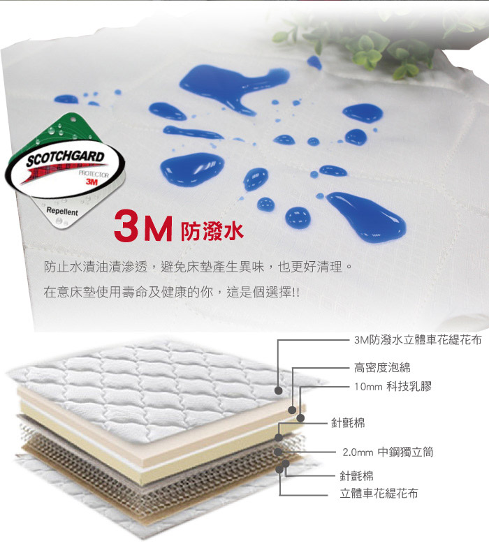 材質說明:3M立體車花緹花布.2.0MM中鋼獨立筒.高密度海棉.乳膠襯墊