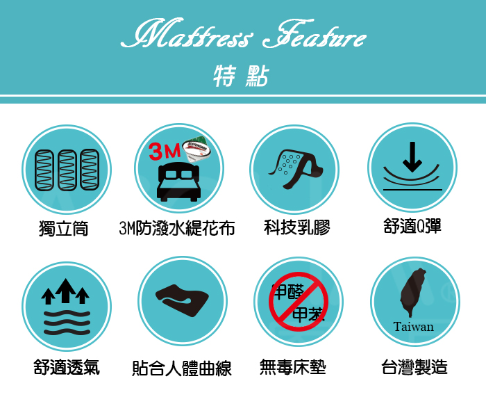 【AISHA】伊達4線3M防潑水乳膠獨立筒床墊偏軟加大雙人床墊,床墊好壞,決定你一生的睡眠時光,選擇一款適合自己的床墊很重要!獨立袋裝獨立筒安靜無噪音,超高回彈性,減少翻身次數,迎合人體S行曲線,智能調節受力,10MM天然乳膠提供持續支持和柔軟的感覺,能消除疲勞,持續睡眠,3M防潑水立體車花緹花布,防止水漬油漬滲透,避免床墊產生異味也更好清理,乳膠獨立筒乳膠獨立筒3M床墊有四角安全防撞,轉角包邊精緻,穩定性及磨耐性,柔軟防撞,安全呵護,四線精湛圍邊,札實細膩的針腳是品質得絕佳保證,讓床墊不易走位,乳膠獨立筒3M床墊的排濕透氣孔,床墊吸收的溼氣都由透氣孔蒸發排出,達到排濕乾爽狀態,減少細菌滋生。