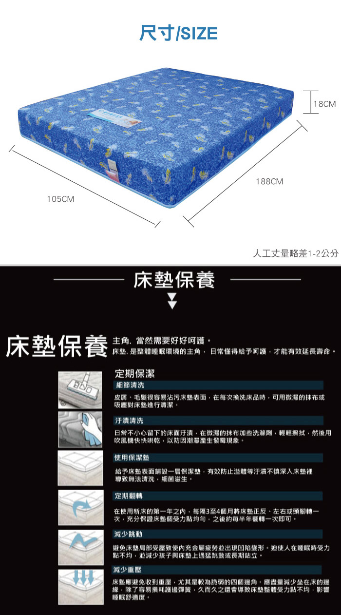 材質說明:中鋼 2.0mm彈簧.印花表布 .高密度海棉.竹蓆