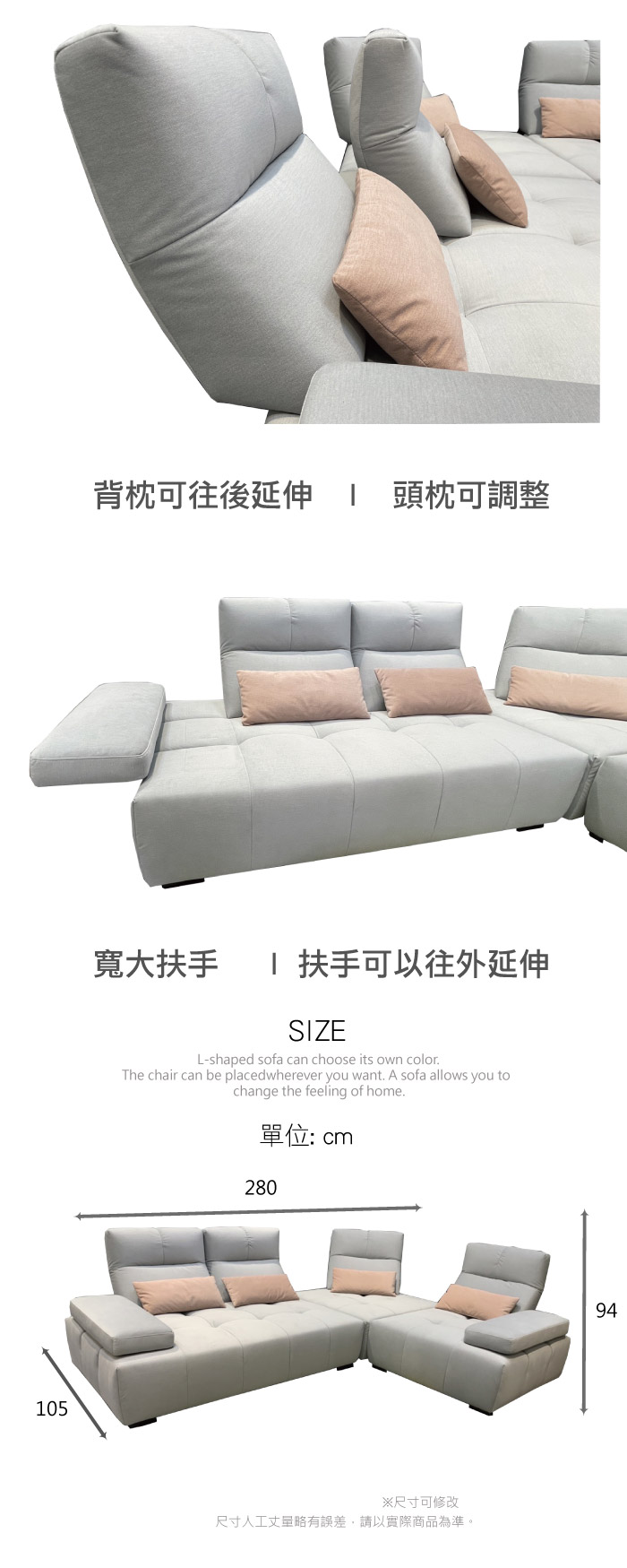 尺寸說明:單位/CM:長/280 寬/105 總高/94 其他尺寸請參考圖片
